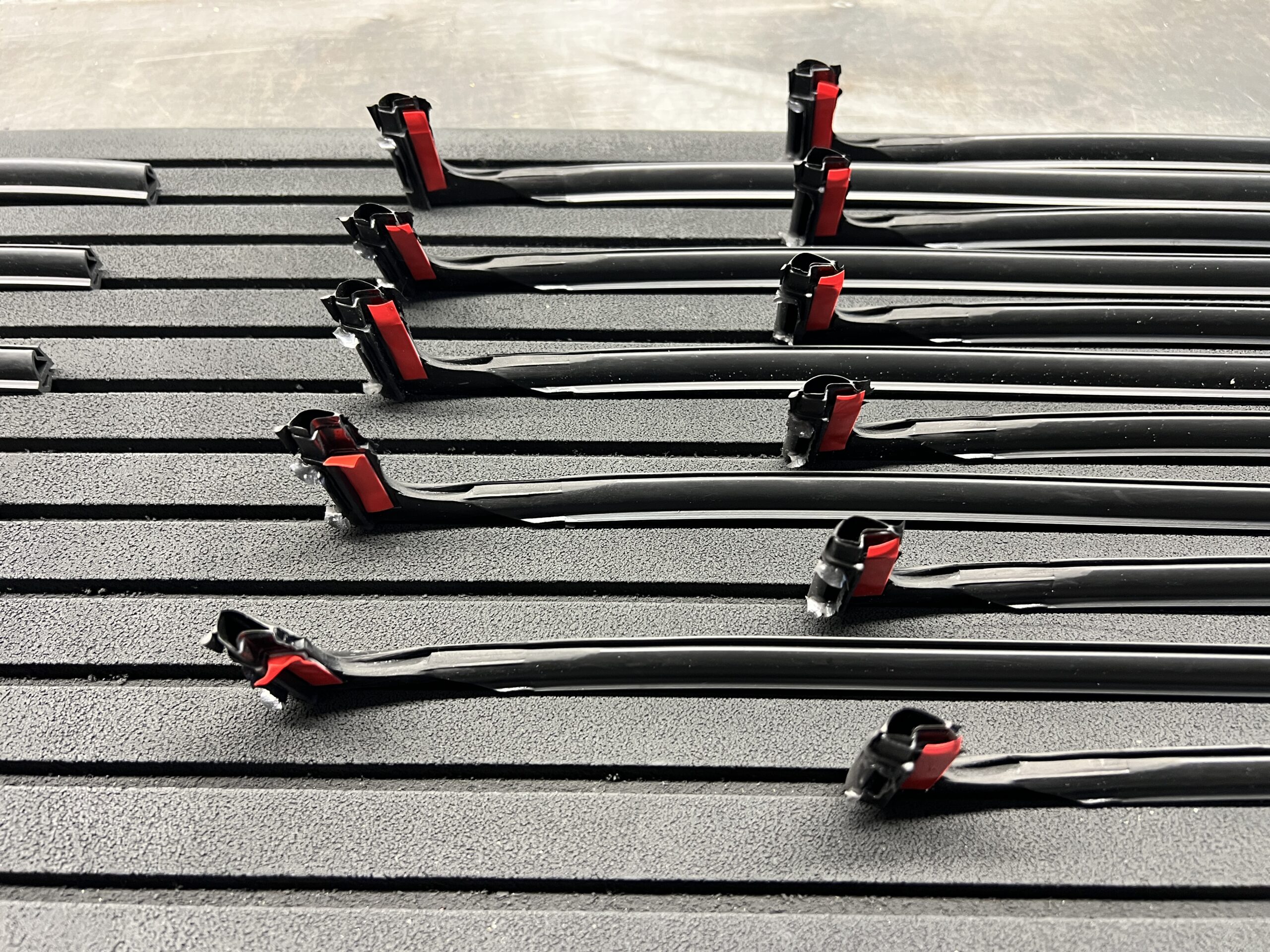 Verniciatura tecnica delle guarnizioni per modanature di tetti apribili. Il focus di questo progetto è la riduzione del Coefficiente di Attrito (CoF). Il trattamento applicato elimina i rumori da sfregamento (squeak & rattle) e garantisce la scorrevolezza dei meccanismi di apertura e chiusura, migliorando il comfort acustico all’interno dell’abitacolo.